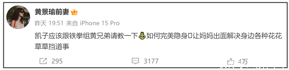 黄景瑜前妻又来发声了!近期于正旗下男演员许凯卷入出轨赌博等风波,引发了热议。没想到的是,黄景瑜前妻王雨馨也下场吃瓜,并发文吐槽许凯应该向铁拳组黄兄弟请教一下如何隐身,让妈妈出面解决,直接把嘲讽拉满。