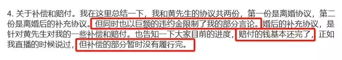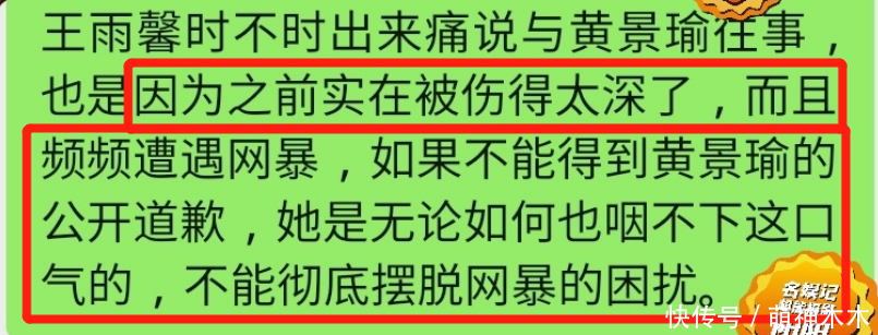 王雨馨事后也曾发文,暗示黄景瑜和她之间的两份协议中,有巨额违约金限制言论相关事宜,换言之也可以理解为是高额的“封口费”,所以很多事情她不能完完整整的向外界说明。也就是说两人和解了,男方对她的伤害,也用金钱弥补了,所以暂时休战。