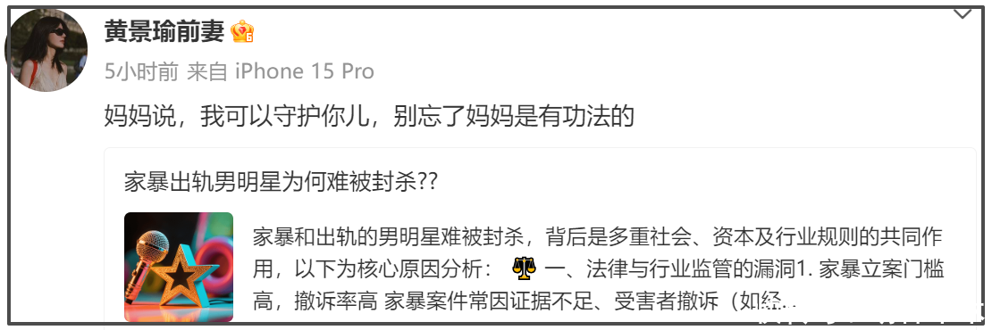随后,王雨馨可能觉得还不够,再次发文嘲讽家暴男的妈妈。王雨馨连续发文也引发黄景瑜粉丝不满,毕竟两人在2023年已经达成和解,这段感情纠葛算是翻篇了,结果女方这么多年一直没完没了揪着黄景瑜,惹来粉丝不满大骂。