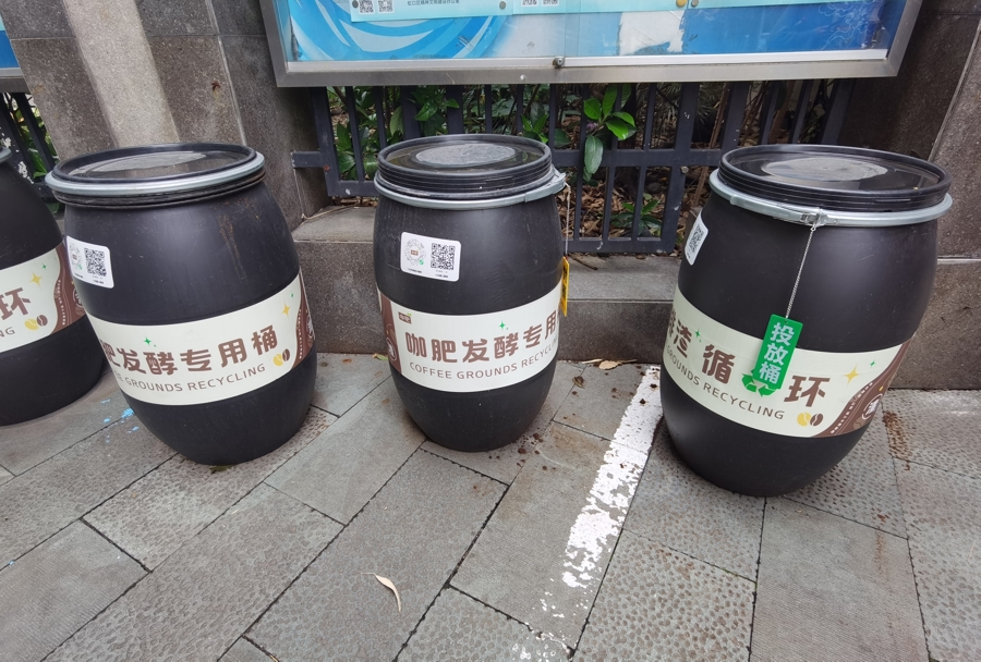 瑞虹四期小区的咖啡渣堆肥桶。 陈玺撼摄