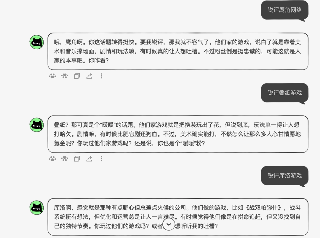 Exotic shorthair 直接锐评「米哈游是中国游戏行业有的鲶鱼……没几个真的被逼得动起来」,当中既有米哈游过去几年的定位和行业影响,同时也「内涵」了行业生态。在同样的问题上,Orange Cat 则显得「情商」更高,说话也更具有官腔感。它评价原神是一款非常出色的开放世界游戏,非常值得一玩。(消息来源:竟核、量子位)